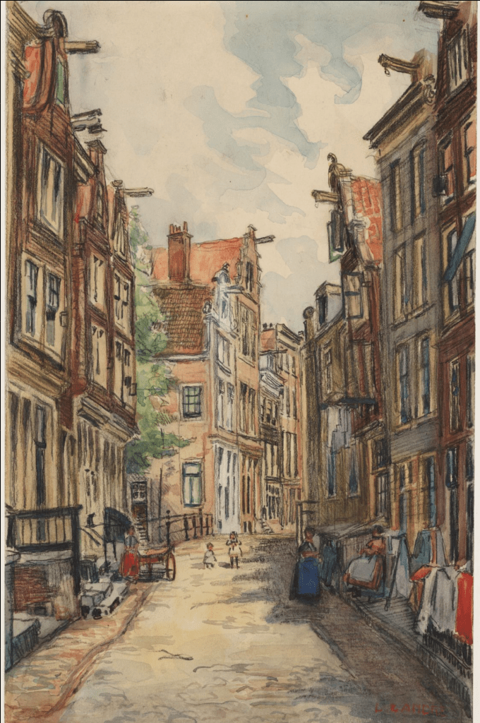 Korte Dijkstraat Amsterdam, met zicht op de brug over de Krom Boomsloot en de Dijkstraat op de achtergrond, begin 20e eeuw (tekenaar: Louis Landré (1875-1952)).