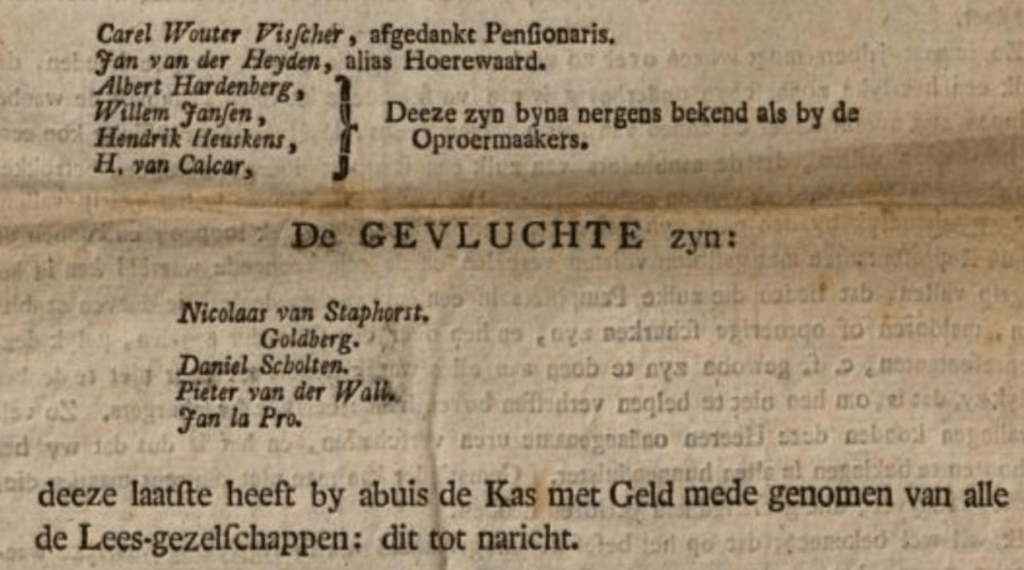 “Jan La Pro – deeze laatste heeft by abuis de kas met geld mede genomen van alle de lees-gezelschappen: dit tot naricht”