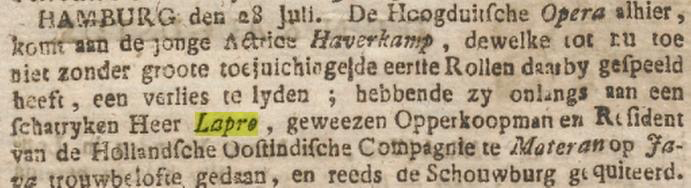Op 6 augustus 1776 duikt de naam La Pro (geschreven Lapro, een veelvoorkomende variatie) op in de Groninger courant (en later in ook andere kranten):
