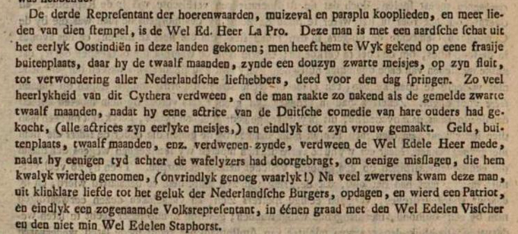 De derde representant der hoerenwaarden, muizeval en paraplu kooplieden, en meer lieden van dien stempel, is de Wel Ed. Heer La Pro. Deze man is met een aardsche schat uit het eerlyk Oostindiën in deze landen gekomen; men heeft hem te Wyk gekend op een fraaije buitenplaats, daar hy de twaalf maanden, zynde een douzyn zwarte meisjes, op zijn fluit, tot verwondering aller Nederlandsche liefhebbers, deed voor den dag springen. Zo veel heerlykheid van dit Cythera verdween, en de man raakte zo nakend als de gemelde zwarte twaalf maanden, nadat hij eene actrice van de Duitsche comedie van hare ouders had gekocht, (alle actrices zyn eerlyke meisjes,) en eindlyk tot zyn vrouw gemaakt. Geld, buitenplaats, twaalf maanden, enz verdwenen zynde, verdween de Wel Edele Heer mede, nadat hy eenigen tyd achter de wafelyzers had doorgebragt, om eenige misslagen, die hem kwalyk wierden genomen (onvrindlyk genoeg waarlyk!). Na veel zwervens kwam deze man, uit klinklare lieffde tot het geluk der Nederlandsche Burgers, opdagen, en wierd een Patriot, en eindlyk een zogenaamde Volksrepresentant […]”