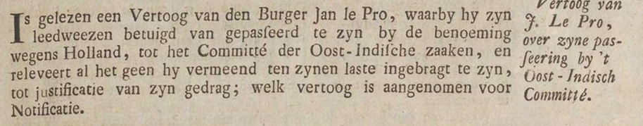 Eind 1795 probeert Jan La Pro een benoeming te verkrijgen in het Comité der Oost-Indische zaken. De V.O.C. was in grote problemen, en zou in maart 1796 genationaliseerd worden. Jan La Pro beschouwde zichzelf natuurlijk als expert. Hij wordt wel voorgesteld namens het Provinciaal Bestuur van Holland, maar blijkbaar wordt die benoeming niet bevestigd. Dan dient hij een bezwaar in bij het provinciaal bestuur van Holland. Ik zou dat dolgraag nog eens inzien. Volgens de beschrijving: “waarin hij releveert al hetgeen hij vermeend ten zynen laste ingebragt te zyn, tot justificatie van zyn gedrag”. Helaas heb ik dat nog niet kunnen vinden: misschien nog te vinden in het fysieke archief van de provincie.