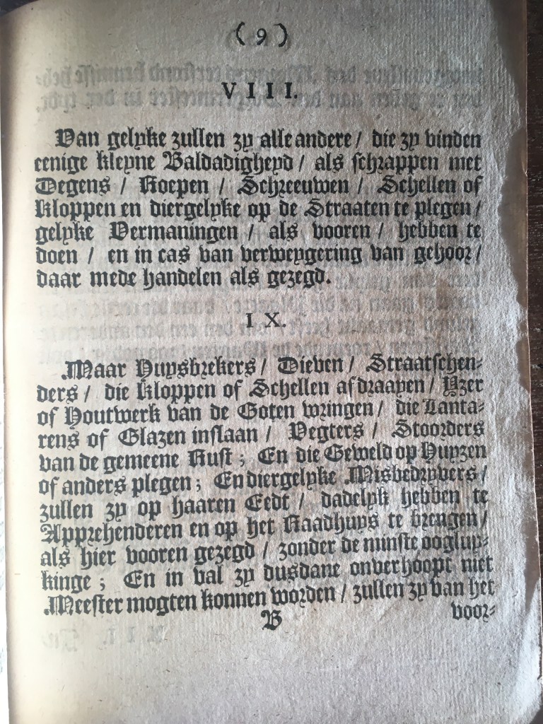 Maar huysbrekers / dieven / straatschenders / die kloppen of schellen afdraayen / ijzer of houtwerk van de goten wringen / die lantarens of glazen inslaan / vegters / stoorders van de gemeene rust; en die geweld op huyzen of anders plegen; en diergelijke misbedrijvers / zullen zij op haaren eedt / dadelijk hebben te apprehenderen en op het raadhuys te brengen / als hier vooren gezegd / zonder de minste oogluykinge; en in val zij dusdane onverhoopt niet meester mogten konnen worden / zullen zij van het voorgevallene des morgens terstond kennisse hebben te geven aan den borgermeester in der tijdt.