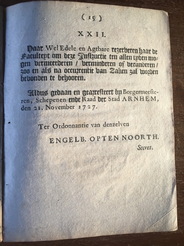 Aldus gedaan en gearresteert bij borgermeesteren, schepenen ende raad der stad Arnhem, den 21. November 1727.
