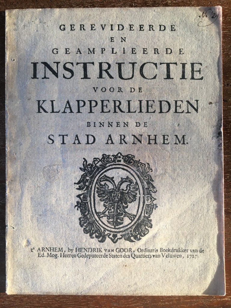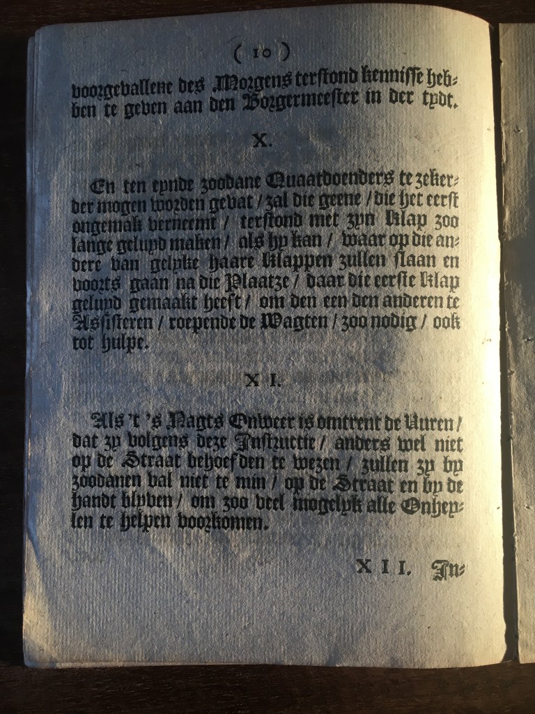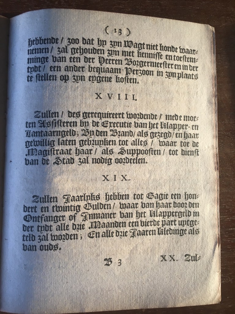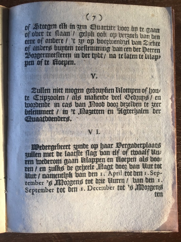 En zullen haar wel wagten eenige straaten of steegen elk in zyn quartier voor by te gaan of over te slaan / gelijk ook op verzoek van den eene of andere / ’t zy op voorwendzel van ziekte of anders buyten toestemming van een der heeren borgermeesteren in der tijdt / na te laten te klappen of te roepen.