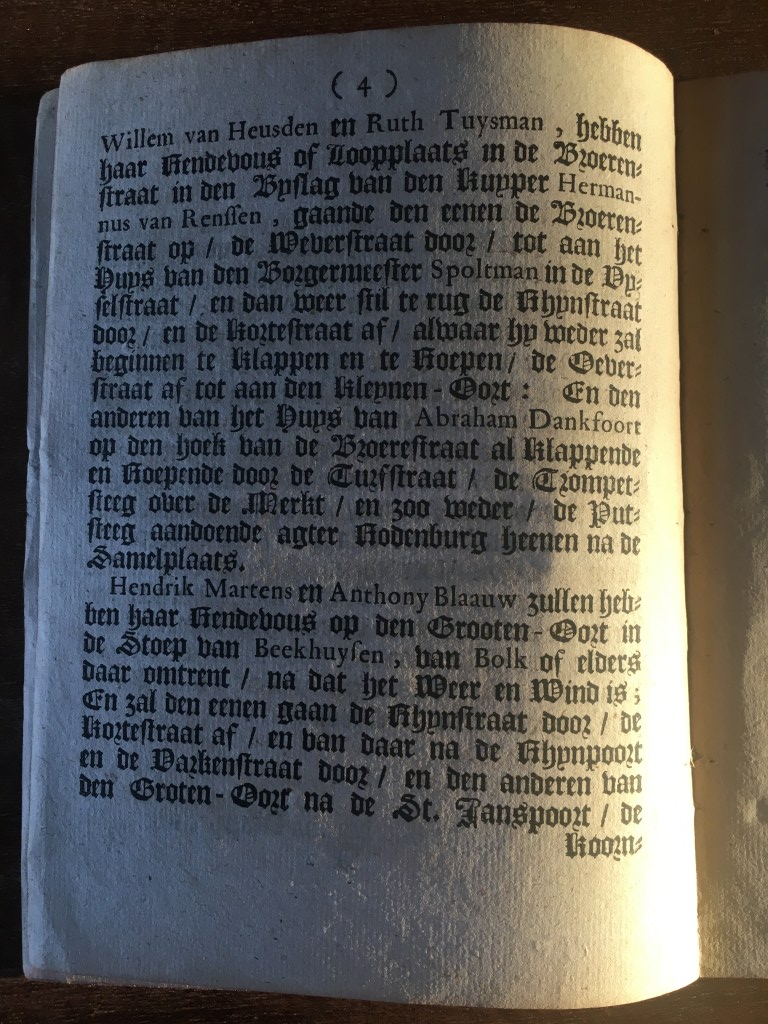 En zullen twee van dezelve klapperlieden / nu Willem van Heusden en Ruth Tuysman, hebben haar rendevous of loopplaats in de Broerenstraat in den Bijslag van den kuyper Hermannus van Renssen, gaande den eenen de Broerenstraat op / de Weverstraat door / tot aan het huys van den Borgermeester Spoltman in de Vijselstraat / en dan weer stil terug de Rhijnstraat door / en de Kortestraat af / alwaar hij weder zal beginnen te klappen en te roepen / de Oeverstraat af tot aan den kleynen-oort: en den anderen van het huys van Abraham Dankfoort op den hoek van de Broerestraat al klappende en roepende door de Turfstraat / de Trompetsteeg over de Merkt / en zoo weder / de Putsteeg aandoende agter Rodenburg heenen na de Samelplaats.