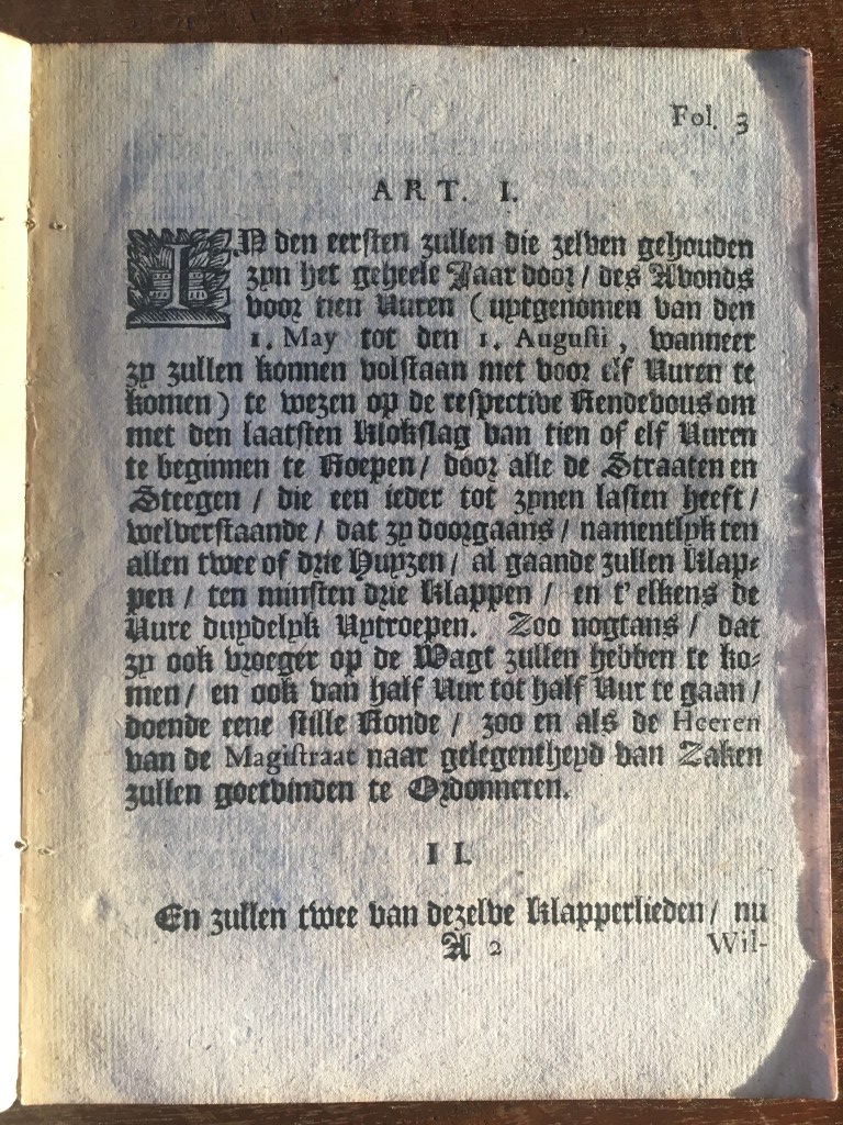 In den eersten zullen die zelven gehouden zijn het geheele jaar door des avonds voor tien uuren (uytgenomen van den 1. May tot den 1. Augusti, wanneer zij zullen konnen volstaan met voor elf uuren te komen) te wezen op de respective rendevous om met den laatsten klokslag van tien of elf uuren te beginnen te roepen / door alle de straaten en steegen / die een ieder tot zijnen last heeft / welverstaande / dat zij doorgaans / namentlijk ten allen twee of drie huyzen / al gaande zullen klappen / ten minsten drie klappen / en t’elkens de uure duydelijk uytroepen. Zoo nogtans / dat zy ook vroeger op de Wagt zullen hebben te komen / en ook van half uur tot half uur te gaan / doende een stille ronde / zoo en als de heeren van de magistraat naar gelegentheyd van zaken zullen goedvinden te ordonneren.