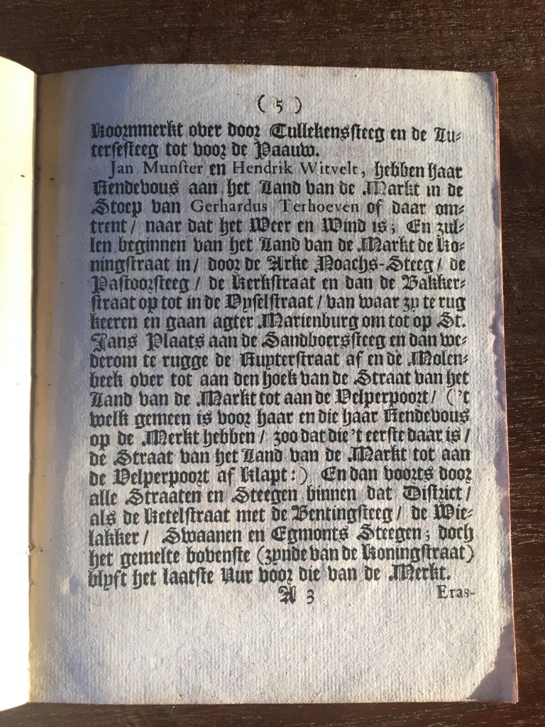 Erasmus ten Westen en Evert Nes, zullen hebben haar Rendevous op den Merkt / op het pothuys van Jacob Zurich, modo Jan van Tongeren; doch zijn om het andere uur bij die geene / die haar Rendevous hebben op het Land van de Markt in de Bijslag van Terhoeven of daaromtrent / om malkanderen des noods aan dien hoek te beter te konnen helpen; en moeten gaan over de Beek / St. Walburgen / over de Merkt / het Sand en de Koningstraat af / door Menthensteeg / de Klarestraat / tot aan den Krommen-Elboogsteeg / en in de Nijstadt.