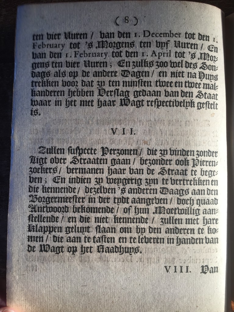 Zullen suspecte perzonen / die zij vinden zonder ligt over straaten gaan / bezonder ook pierenzoekers / vermaanen haar van de straat te begeven; en indien zij weygerig zijn te vertrekken en die kennende / dezelven ’s anderen daags aan den borgermeester in der tijdt aangeven / doch quaad antwoord bekomende / of hun moetwillig aanstellende / en die niet kennende / zullen met hare klappen geluyt slaan om bij den anderen te komen / die aan te tasten en te leveren in handen van de wagt op het raadhuys.
