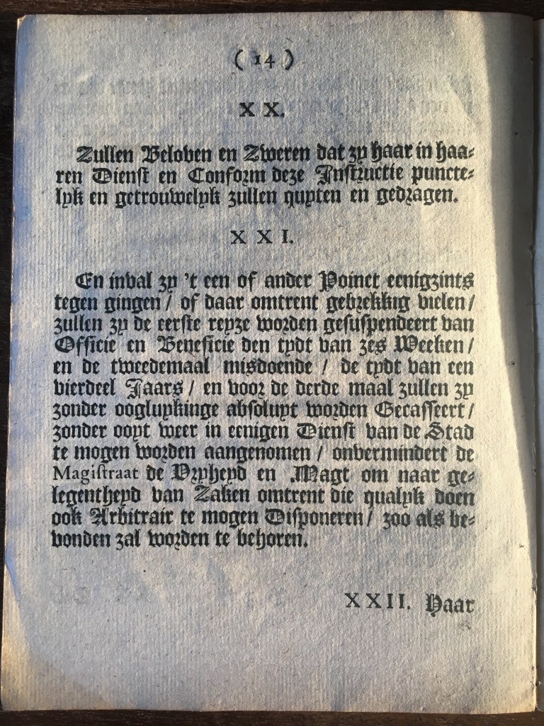En inval zij ’t een of ander poinct eenigzints tegen gingen / of daar omtrent gebrekkig vielen / zullen zij de eerste reyze worden gesuspendeert van officie en beneficie den tijdt van zes weeken / en de tweedemaal misdoende / de tijdt van een vierdeel jaars / en voor de derde maal zullen zij zonder oogluykinge absoluut worden gecasseert / zonder ooyt weer in eenigen dienst van de stad te mogen worden aangenomen / onvermindert de magistraat de vrijheyd en magt om naar gelegentheyd van zaken omtrent die qualijk doen ook arbitrair te mogen disponeren / zoo als bevonden zal worden te behoren.