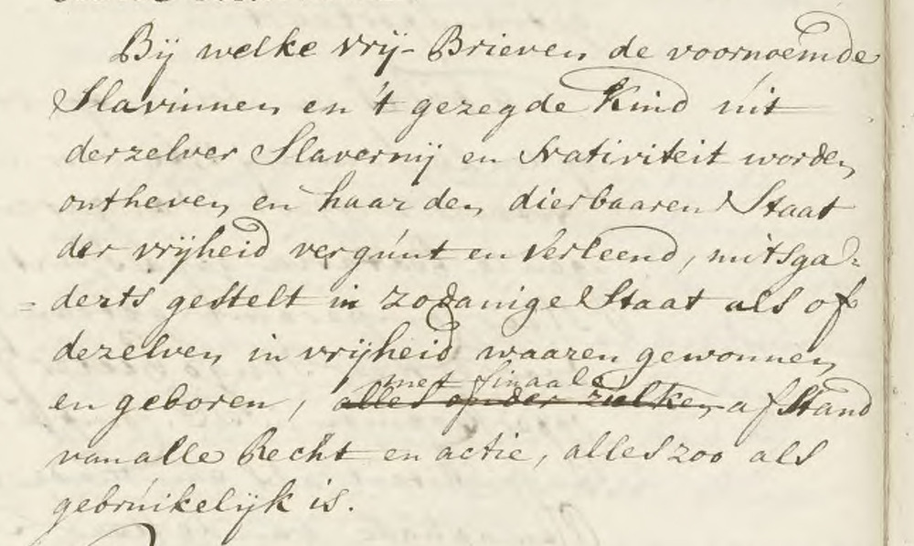 Met deze acte geeft hij opdracht om in Batavia te regelen dat ze vrijbrieven krijgen.