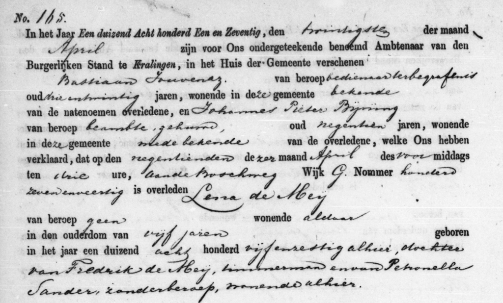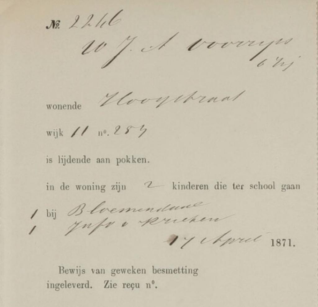 Er is geen nummer ingevuld voor het bewijs van geweken besmetting – de arme kleine Wilhelmina Voorrips overleed op 19 april 1871***. Dezelfde dag als Lena de Meij.