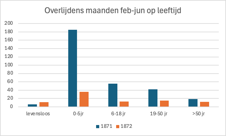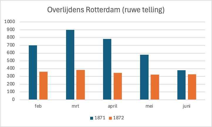 Ik heb ook even een snelle ruwe schatting gemaakt van de overlijdens in de buur-gemeente Rotterdam in die periode, aan de hand van de acte-nummers (dus niet individueel nagelopen). Er waren in die 5 maanden van 1871 3338 overlijdens, tegen 1744 overlijdens in dezelfde maanden in 1872. Bijna het dubbele. Rotterdam had in die tijd ongeveer 100,000 inwoners. Voor een snelle, ruwe schatting kom je uit op zo’n 1594 overlijdens als “oversterfte”. Dat wil zeggen dat 1,6% van de bevolking van Rotterdam extra stierf in 5 maanden tijd.